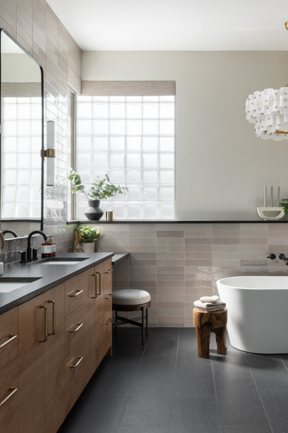We delivered a complete interior refresh on Primary Bedroom and Bathroom, taking down walls that enclosed the shower, moving the tub to make room for the custom island and seating, and installing tile, mirrors, and lighting fixtures. In the bedroom, we color-drenched the walls and applied wallpaper, and hung a separating barn door between the bedroom and bath.