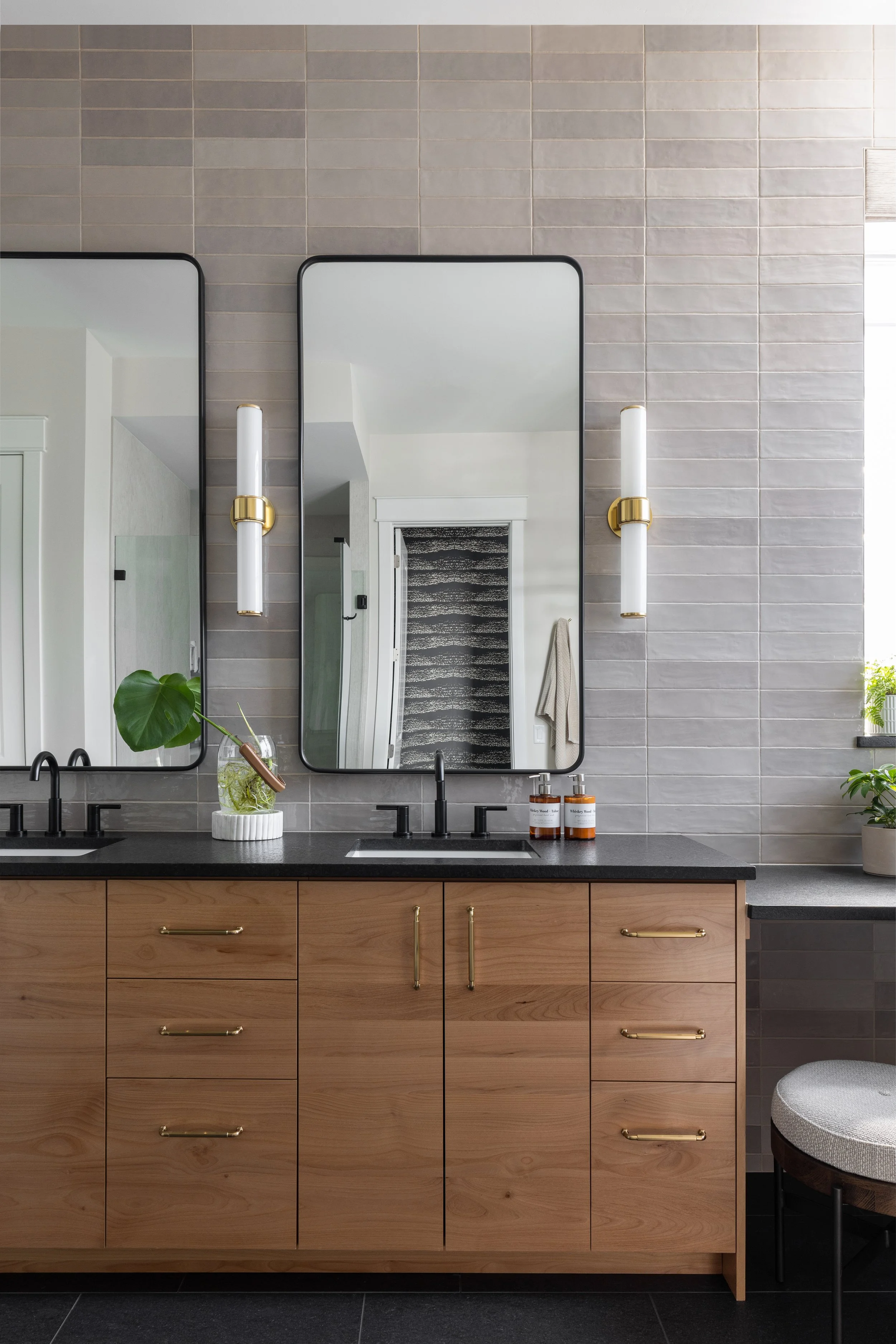 We delivered a complete interior refresh on the Primary Bedroom and Bathroom, taking down walls that enclosed the shower, moving the tub to make room for the custom island and seating, and installing tile, mirrors, and lighting fixtures. In the bedroom, we color-drenched the walls and applied wallpaper, and hung a separating barn door between the bedroom and bath.
